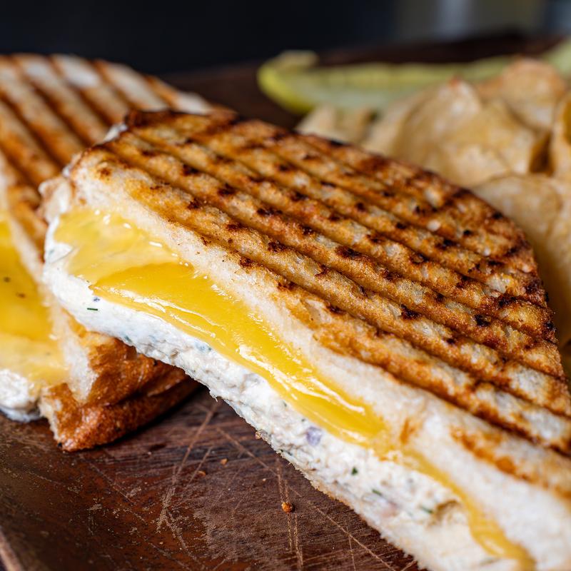 Tuna mixed with green apple, walnuts, celery, shallots, & dill cream cheese. Served on toasted sourdough & topped with melted gouda.