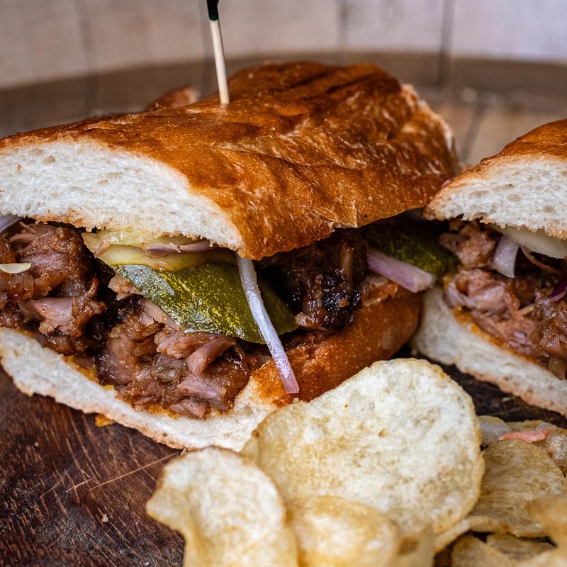 Pork rib meat tossed in sweet & tangy BBQ, topped with pickles & red onions. Served on a toasted baguette.