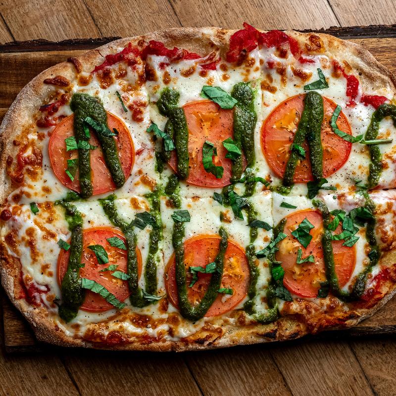 Tomato sauce, house-made pesto, sliced Roma tomatoes, & four cheese blend. Topped with fresh basil.