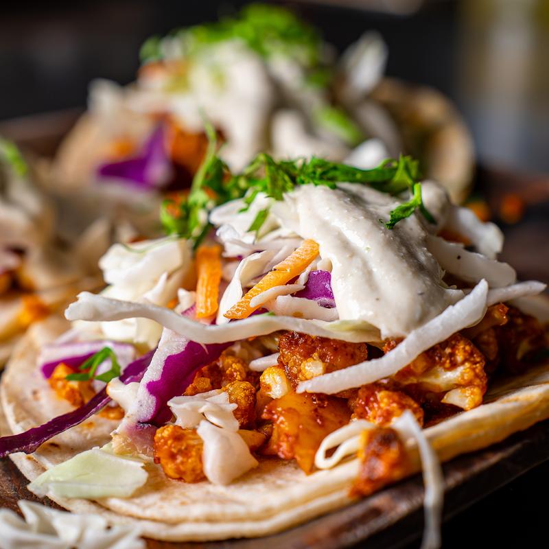 3 tacos. Oven-roasted cauliflower tossed in chipotle maple romesco. Topped with cabbage, onions, & cashew crema.