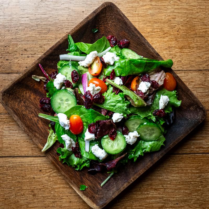Mixed greens, onions, cucumber, cherry tomatoes, dried cranberries, & goat cheese. Tossed in mustard vinaigrette.