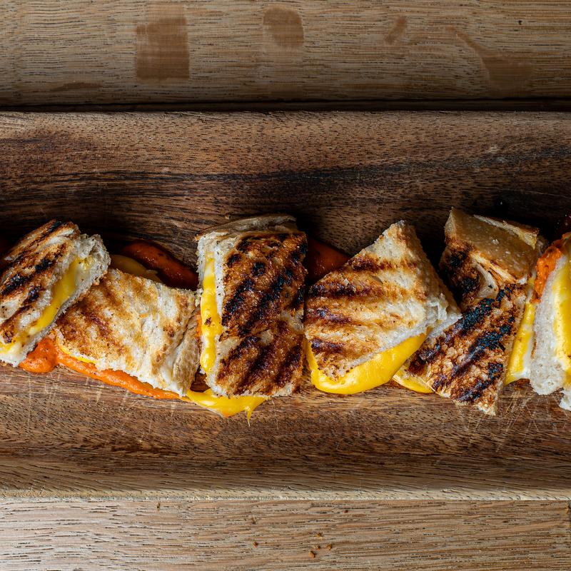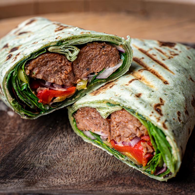 Beyond meat sausage, roasted bell peppers, hot Italian peppers, carrots, red onion, arugula, sun-dried tomatoes, & house-made cashew cheese. Pressed in a spinach wrap.