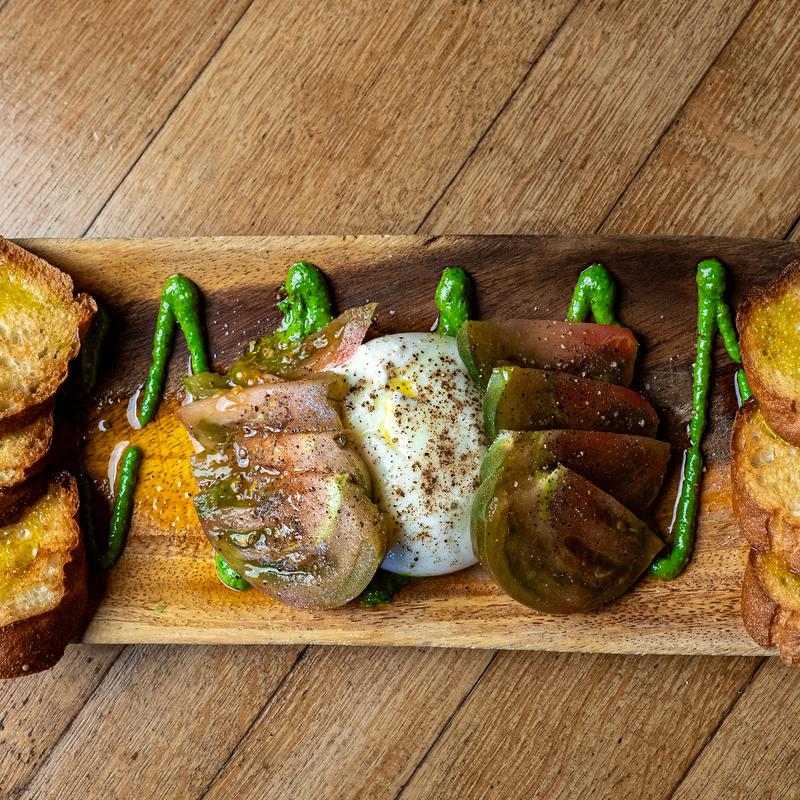 Burrata & sliced heirlooms, drizzled with basil pesto & olive oil. Served with a toasted baguette.