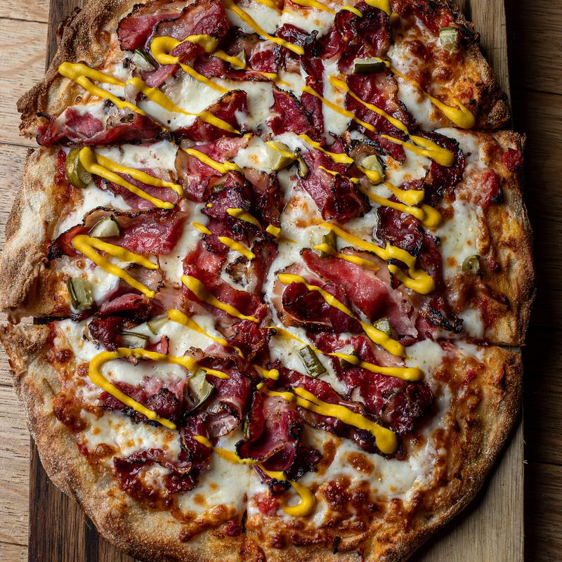 Tomato sauce, four cheese blend, pastrami, pickles, & yellow mustard.