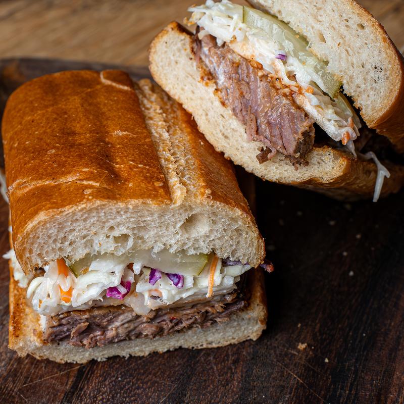 Served with your choice of: Smoky jo jo (traditional BBQ), Carolina gold (mustard BBQ), spicy umami (spicy asian style bbq). Topped with pickles and house slaw. Served on a toasted baguette.