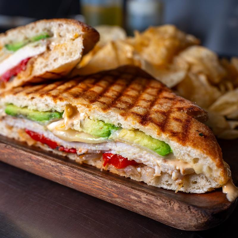 Chipotle rubbed chicken, roasted onions & bell peppers, muenster, avocado, & chipotle mayo. Served on pressed ciabatta.