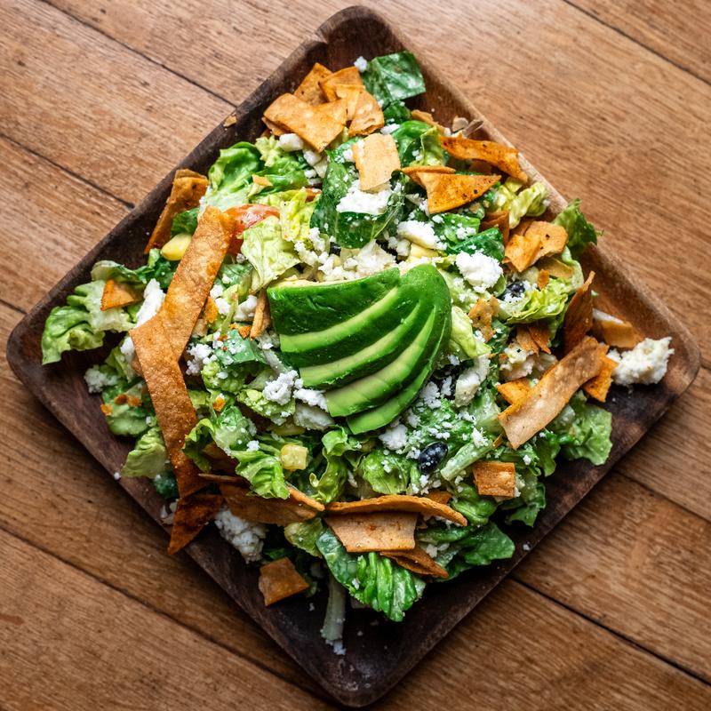 Black beans, roasted corn, grape tomatoes, red onions, & baby gem lettuce. Tossed in cilantro lime dressing & topped with avocado, queso fresco, & tortilla chips.