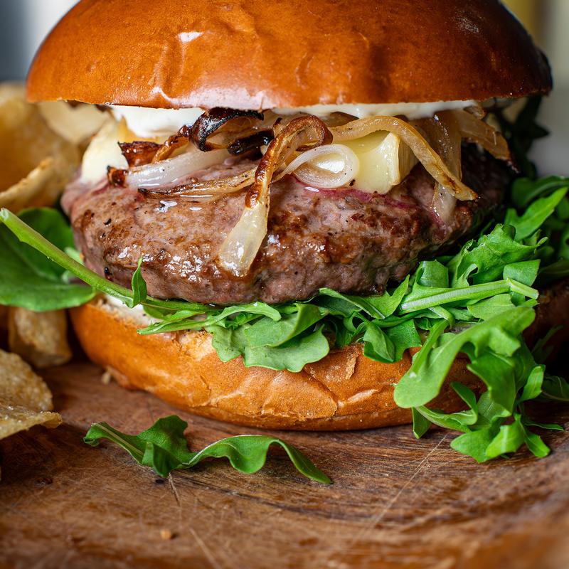 Grass-fed angus beef, arugula, roasted onions, brie cheese, & garlic aioli. Served on a toasted brioche bun.