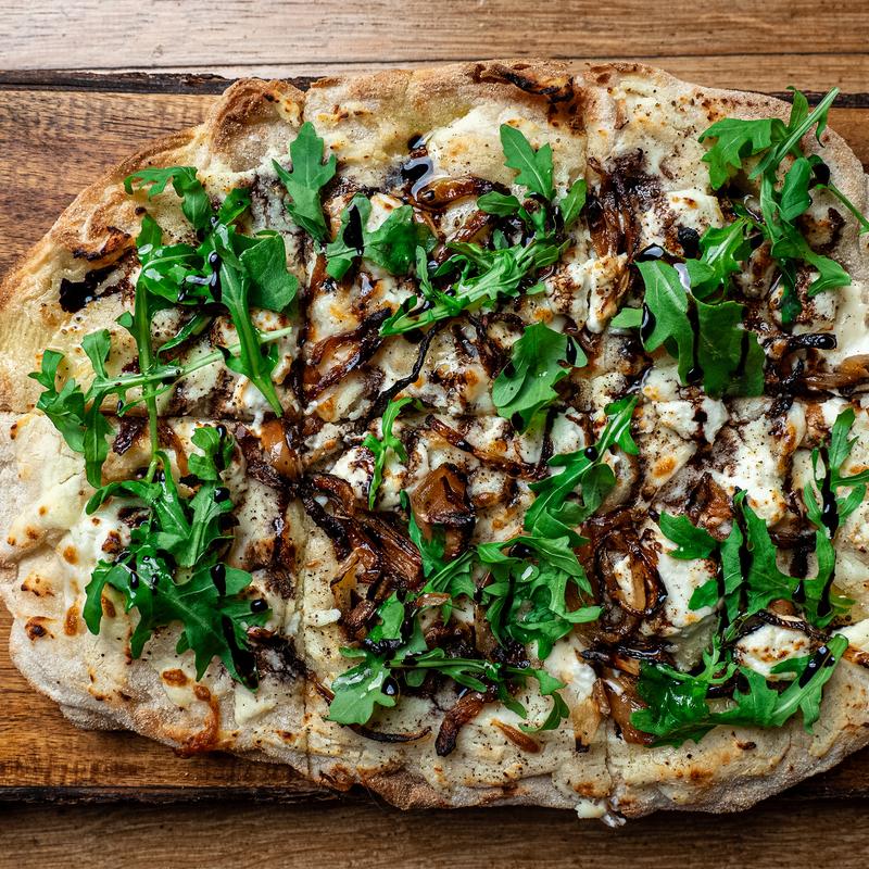 Ricotta cheese, goat cheese, arugula, & caramelized onion. Drizzled with olive oil & balsamic reduction.