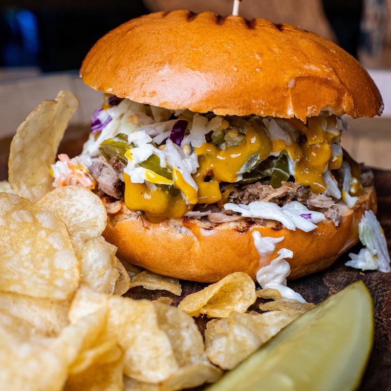 Pulled pork tossed in Carolina Gold BBQ sauce, topped with pickled jalapeños & house slaw. Served on a toasted brioche bun.