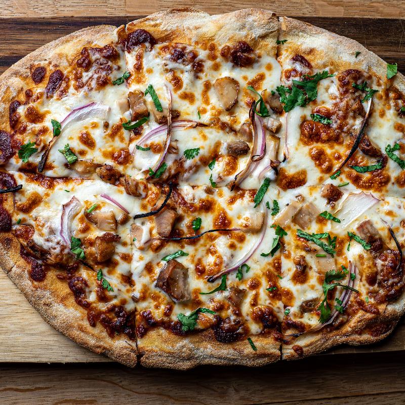 House-made BBQ sauce, chicken thigh, four cheese blend, & red onion. Topped with fresh cilantro.