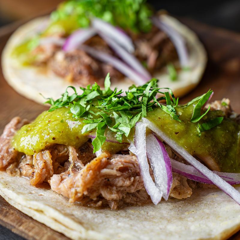 2 tacos, house-smoked pork, cilantro, & onions. Topped with Chef Alex's spicy salsa verde.
